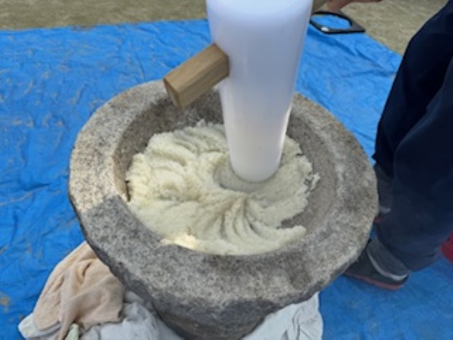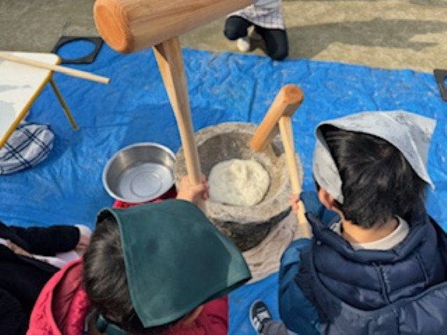 お天気が心配されましたが、午前中は雨も降らず、予定通りおもちつきをすることができました。 もち米から徐々にお餅になっていく様子に興味津々の子どもたち。実際に自分たちで杵を持っておもちつきをしたり、できたお餅を触ってみたりしながら、この季節ならではの行事を楽しんでくれていました☆ 保護者の皆様、御準備等ありがとうございました。 |