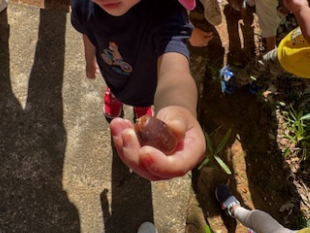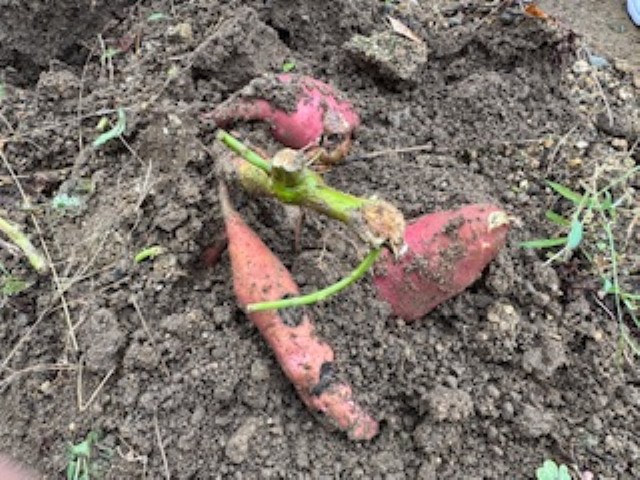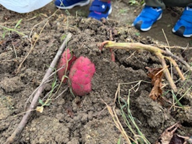 小雨がぱらつくこともありましたが、本園から第二までおいも掘りへ行きました。今年は夏の暑さのせいもあってか、おいもの生育状況が心配されました。実際に土を掘っていってみると、数は多くないものの、中には大きなおいもさんもあり、子どもたちも「あった~!」「おいもみつけた!!」と喜んでいました。3歳児さんは自力で土を掘っていくことが難しい子もいましたが、4歳、5歳になると自分でどんどん掘り進めていくことができ、「せんせいみて!!」と笑顔がたくさん見られました♪また来年もおいも掘りができるといいですね☆ |