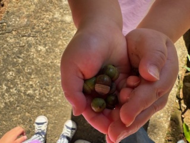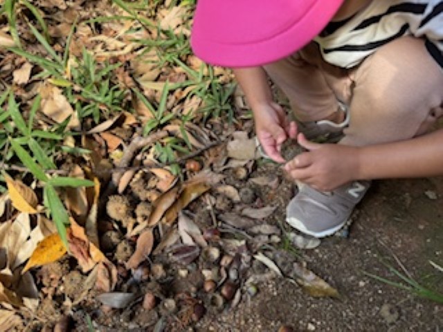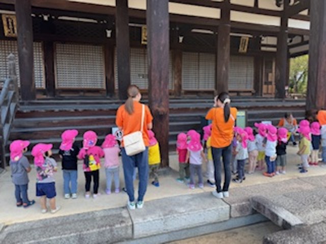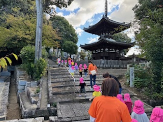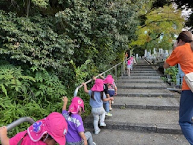 気温も落ち着き、朝夕が涼しく感じられる季節になりましたね。 今日は第二深草保育園の2歳児さんが近くの宝塔寺さんへお散歩に行かせていただきました。友だち同士で手をつないで歩く姿に少しお兄さんお姉さんらしさを感じました。 本堂にお参りをし、いざドングリ探し!!すると、、、あちらこちらでドングリを発見☆帽子をかぶっているドングリや穴の開いたドングリ、黄緑色のドングリや細長いドングリ。形や色の違いを発見し、喜ぶ子どもたち♪両手いっぱいにドングリを集めて幸せそうでした☆ |